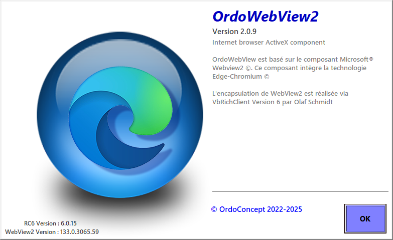 Displays the following dialog box, allowing to know the versions of the control, the RC6 and the active WebView2 component :